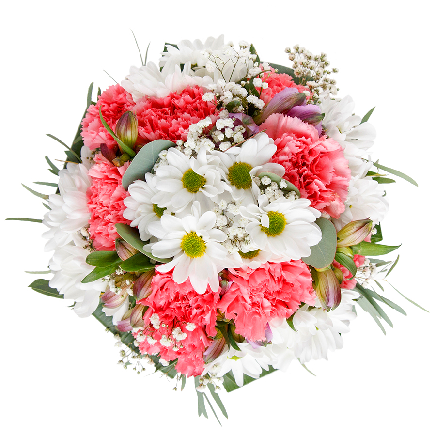 Our Pure Elegance White & Pink Bouquet is the epitome of sophistication and charm. This distinctive arrangement showcases snow-white chrysanthemums, delicate gypsophila, and soft light pink carnations, all elegantly paired with vibrant aspidistra leaves to create a breathtaking display.